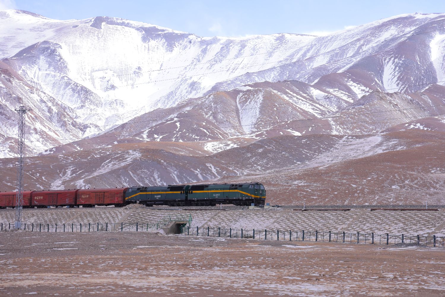 2月12日,一列货运列车行驶在青藏铁路上。(图片来源:中新社)