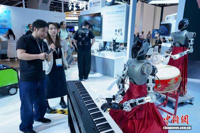 图为北京一家企业研发的机器人在现场演奏乐器。