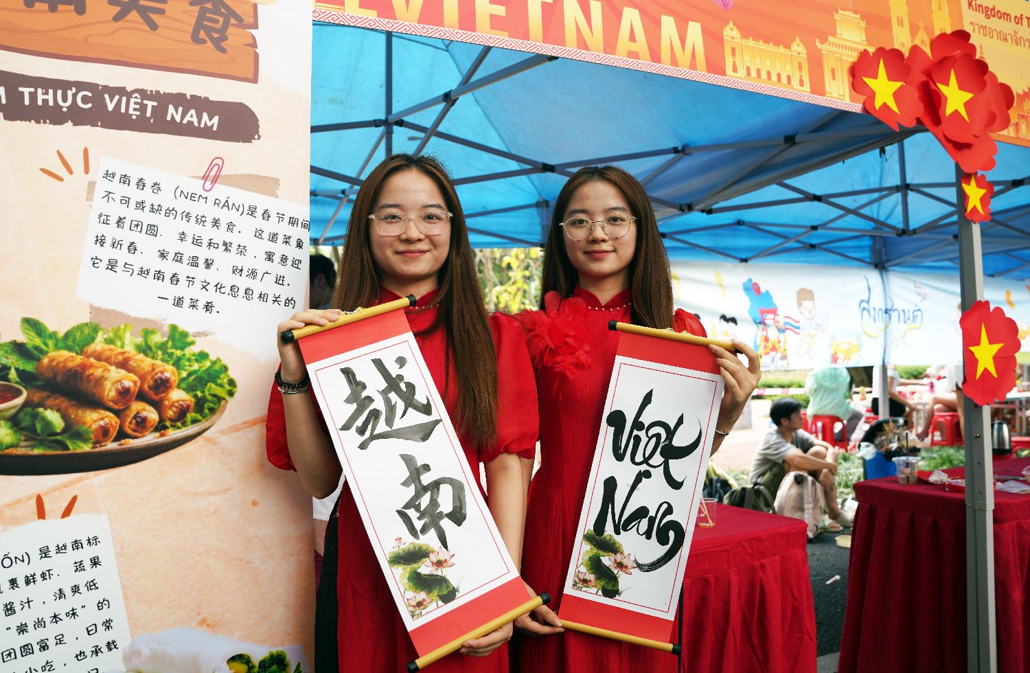 越南留学生阮玉英(右)和阮玉映在活动中合影。(图片来源:中新社)