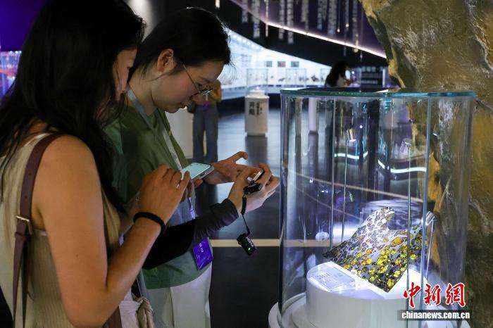 图为文昌极星陨石博物馆内展出的多款陨石标本吸引海内外媒体人细细观看。
