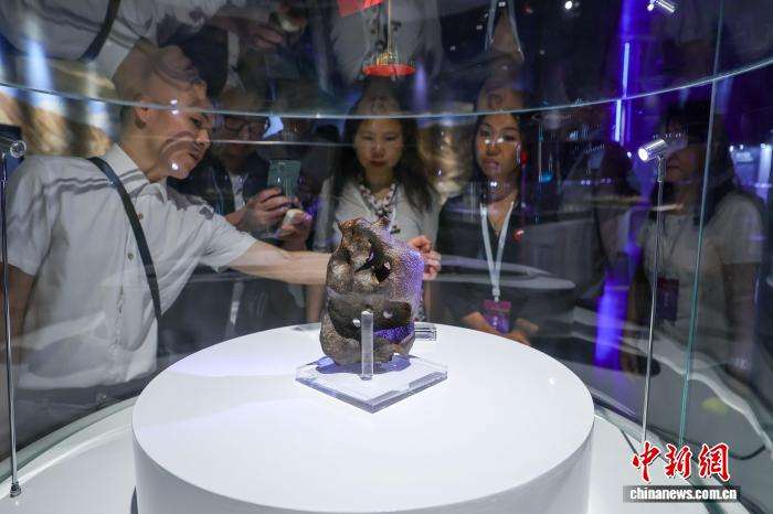 图为“镇馆之宝”新疆火焰山铁陨石吸引海内外媒体人围观。