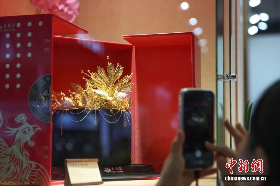 4月15日,参观者拍摄老凤祥黄金冠饰“凤舞九天·金凤冠”。