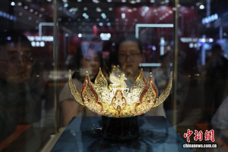 4月15日,参观者在老凤祥展区欣赏黄金作品《鎏金骐翼·莲鸣 八音盒》。