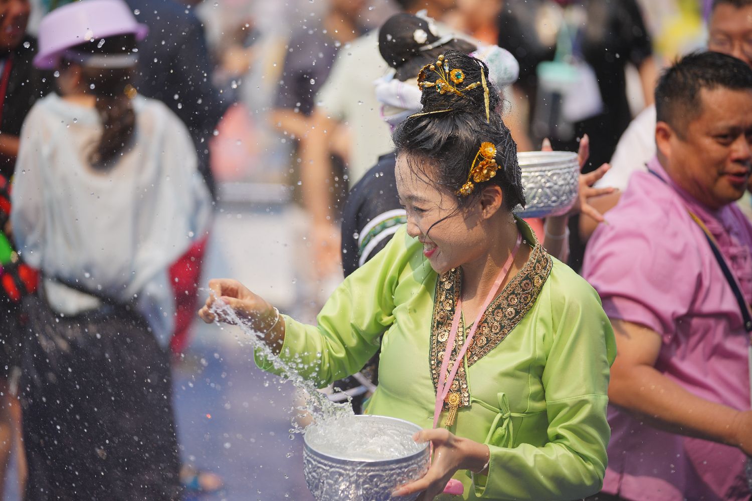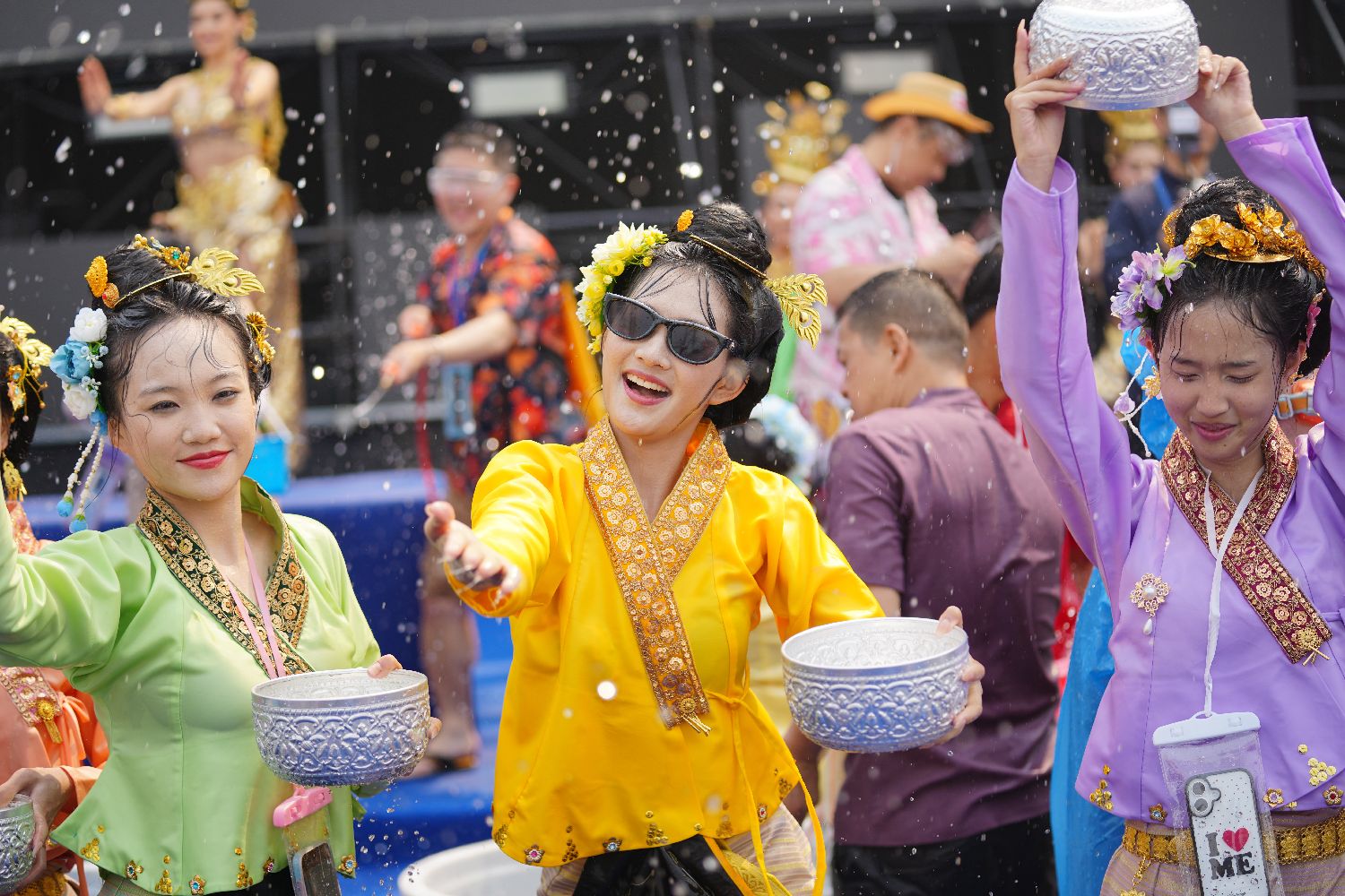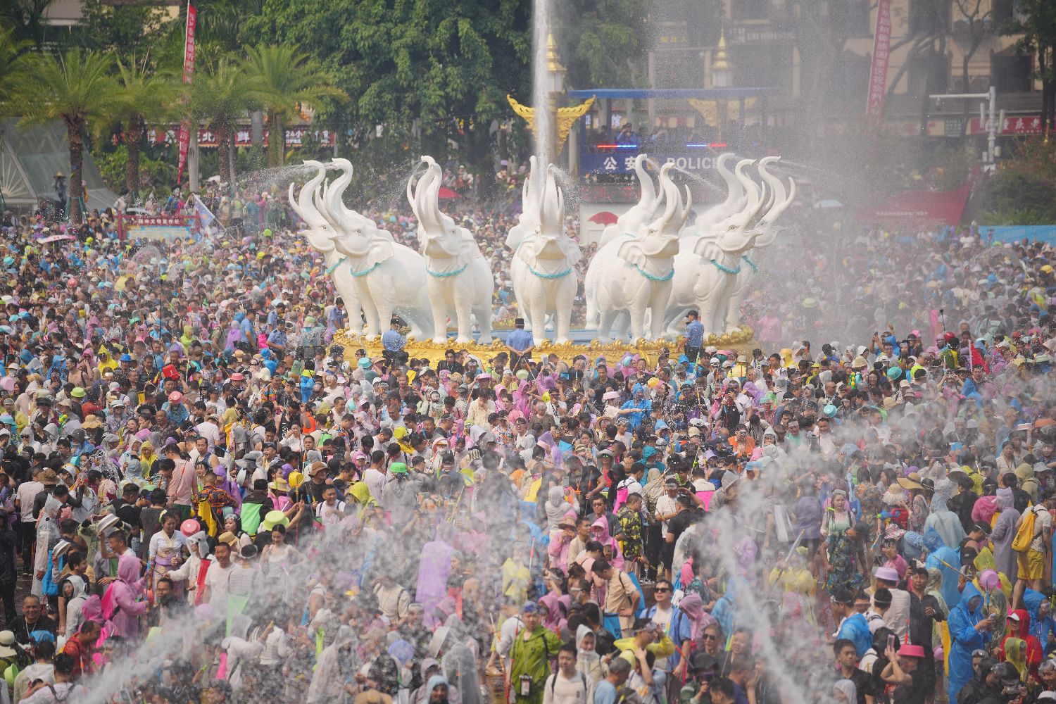 4月15日,来自海内外的游客相聚云南省西双版纳傣族自治州景洪市,与当地各族民众泼水送福、共享欢乐。