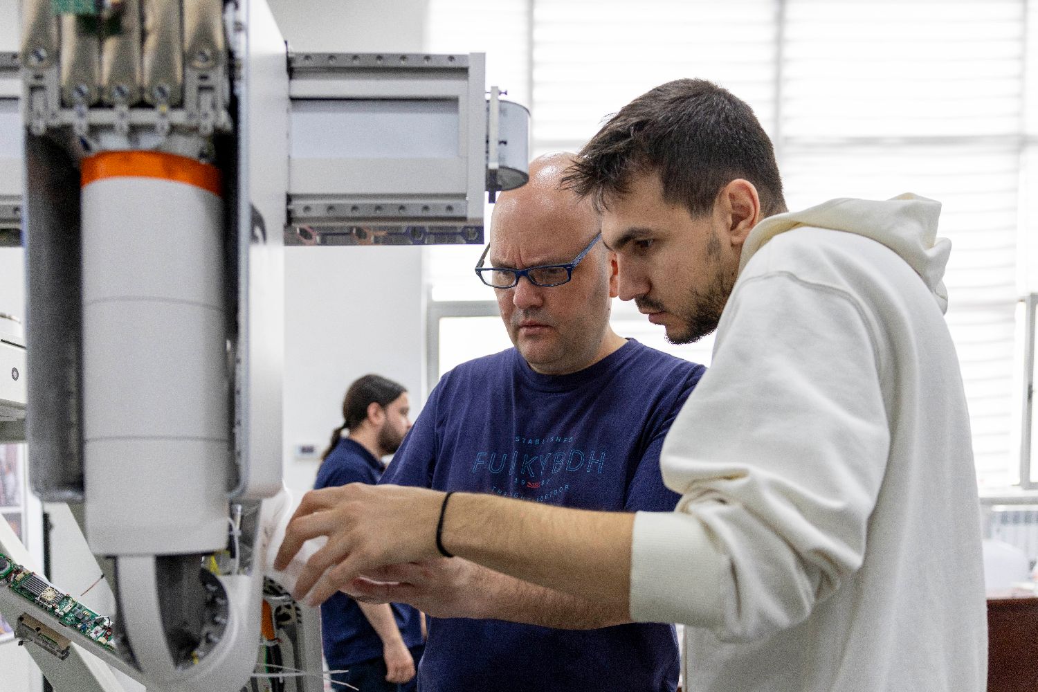 4月16日,在哈尔滨思哲睿智能医疗设备股份有限公司生产车间,工作人员在对设备进行调试。