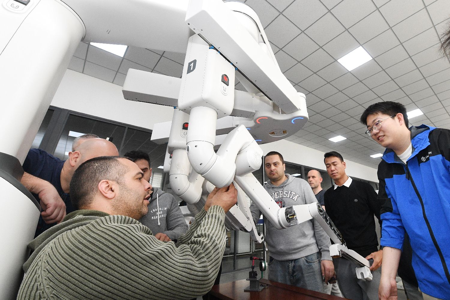 4月16日,在哈尔滨思哲睿智能医疗设备股份有限公司技术服务培训中心,技术人员对国外的临床支持工程师进行培训。(图片来源:本文图片均据新华社)