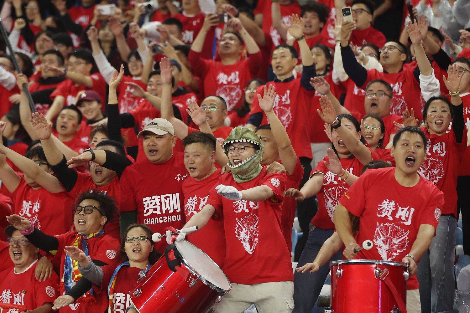 北京时间4月11日晚,2026年江苏省城市足球联赛(苏超)揭幕战在常州奥体中心体育场举行,常州队3比0战胜南通队。图为常州队球迷庆祝常州队获胜。 (图片来源:中新社)