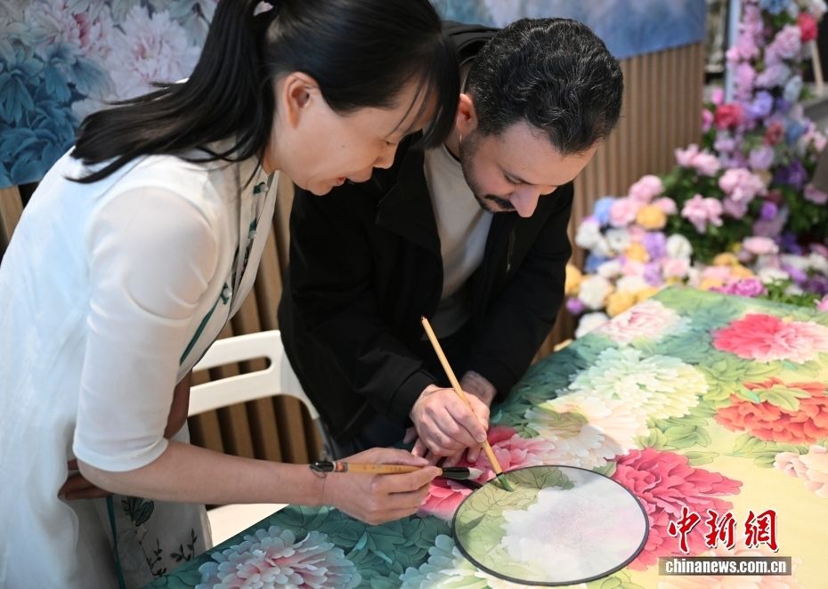 图为外国嘉宾体验使用毛笔上色。