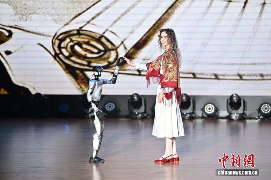 图为学习人工智能(AI)的俄罗斯籍留学生安心与人形机器人互动。