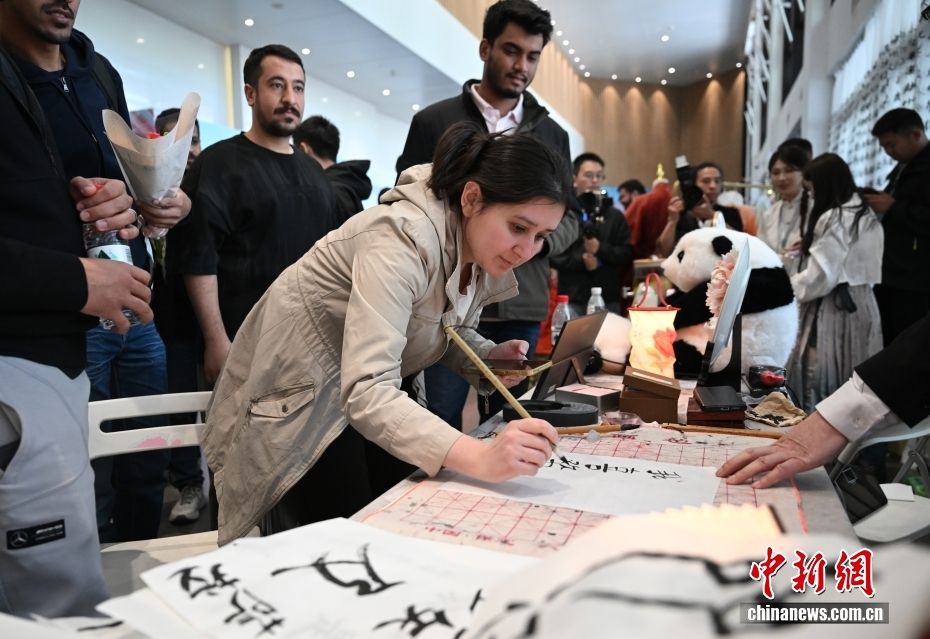 图为外国嘉宾用毛笔写书法。
