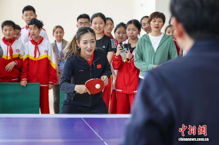 图为刘诗雯在国球进校园环节中和贵阳一中老师切磋球技。