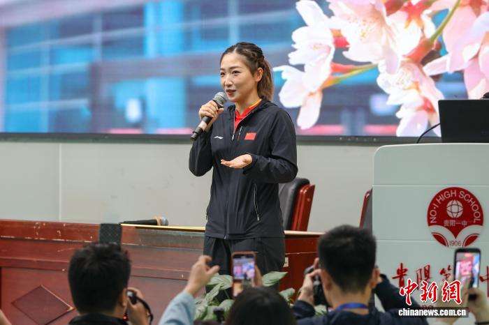 图为刘诗雯在国球进校园环节中和贵阳一中学生交流。