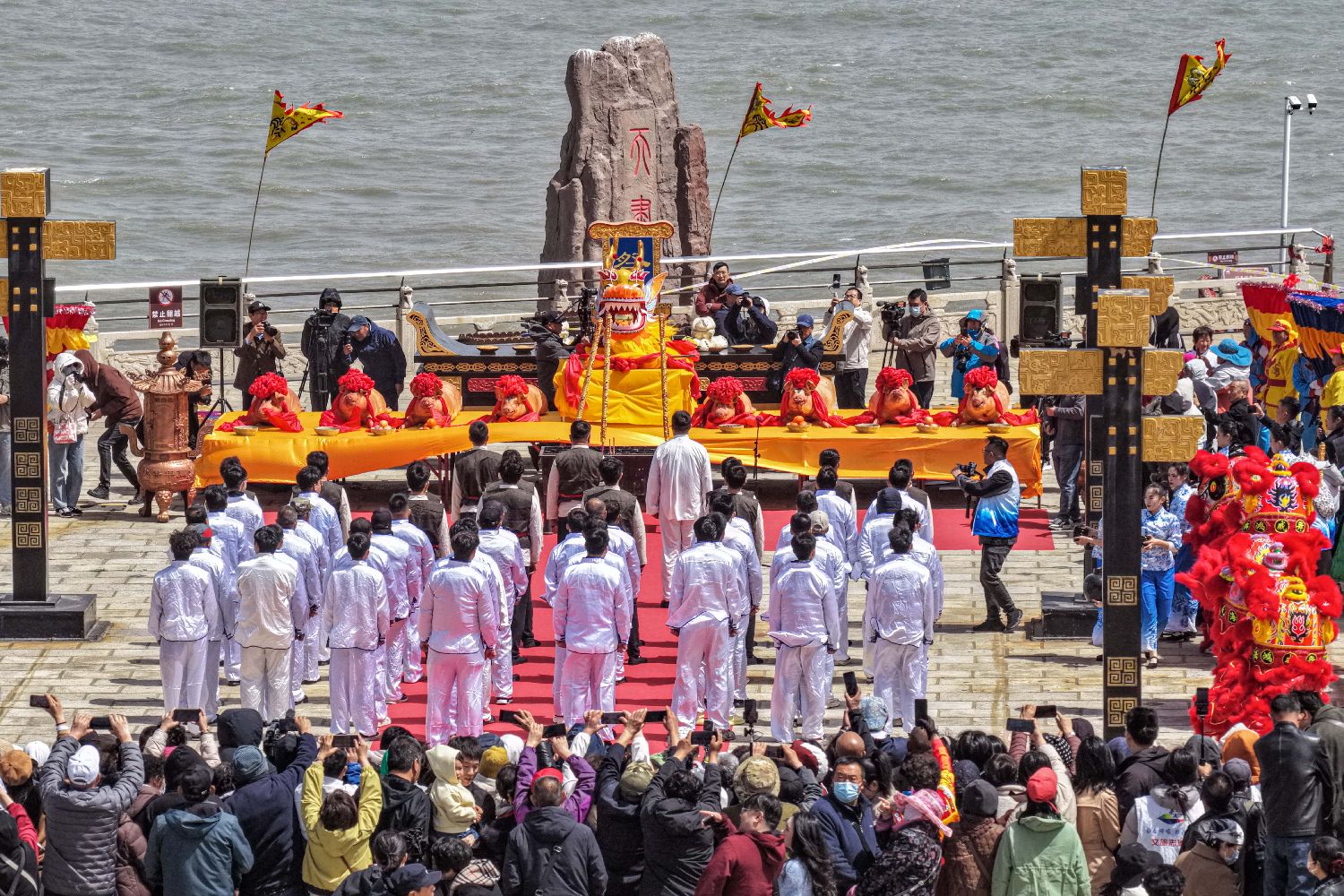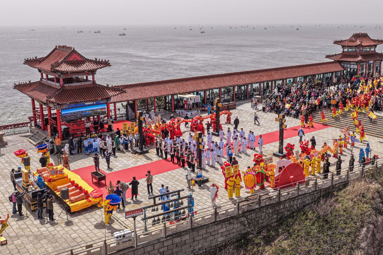 4月20日,谷雨时节,山东荣成成山头景区举办祭海仪式,呈现渔民祈福的民俗盛况。