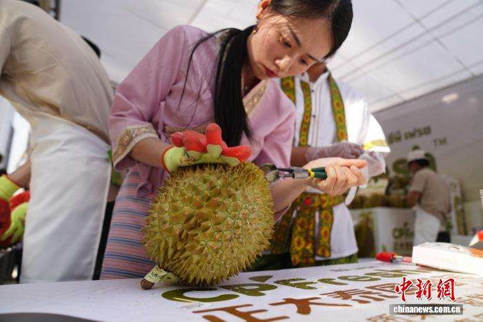 图为工作人员现场为市民开榴莲。
