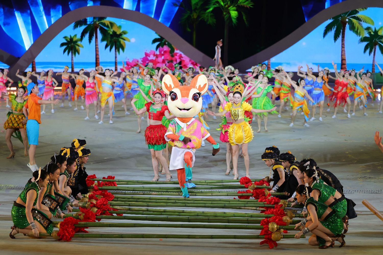 4月22日晚,第六届亚洲沙滩运动会开幕式在三亚亚沙公园举行。图为吉祥物“亚亚”跳竹竿舞。