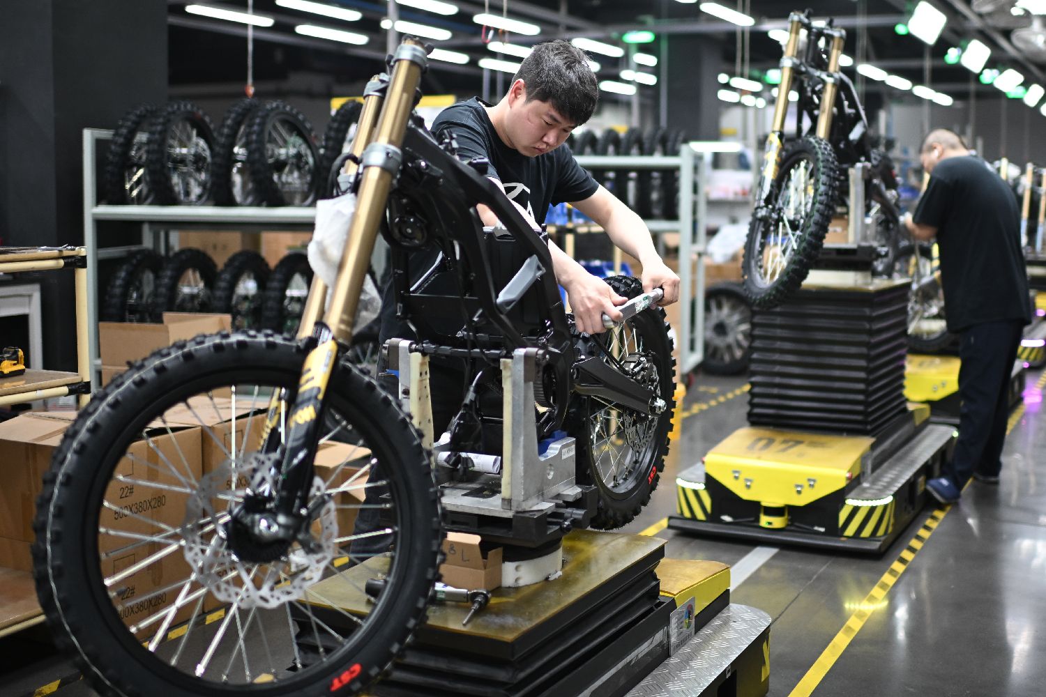 4月10日,工作人员在重庆虬龙科技有限公司总装车间组装电动摩托车。(图片来源:中新社)