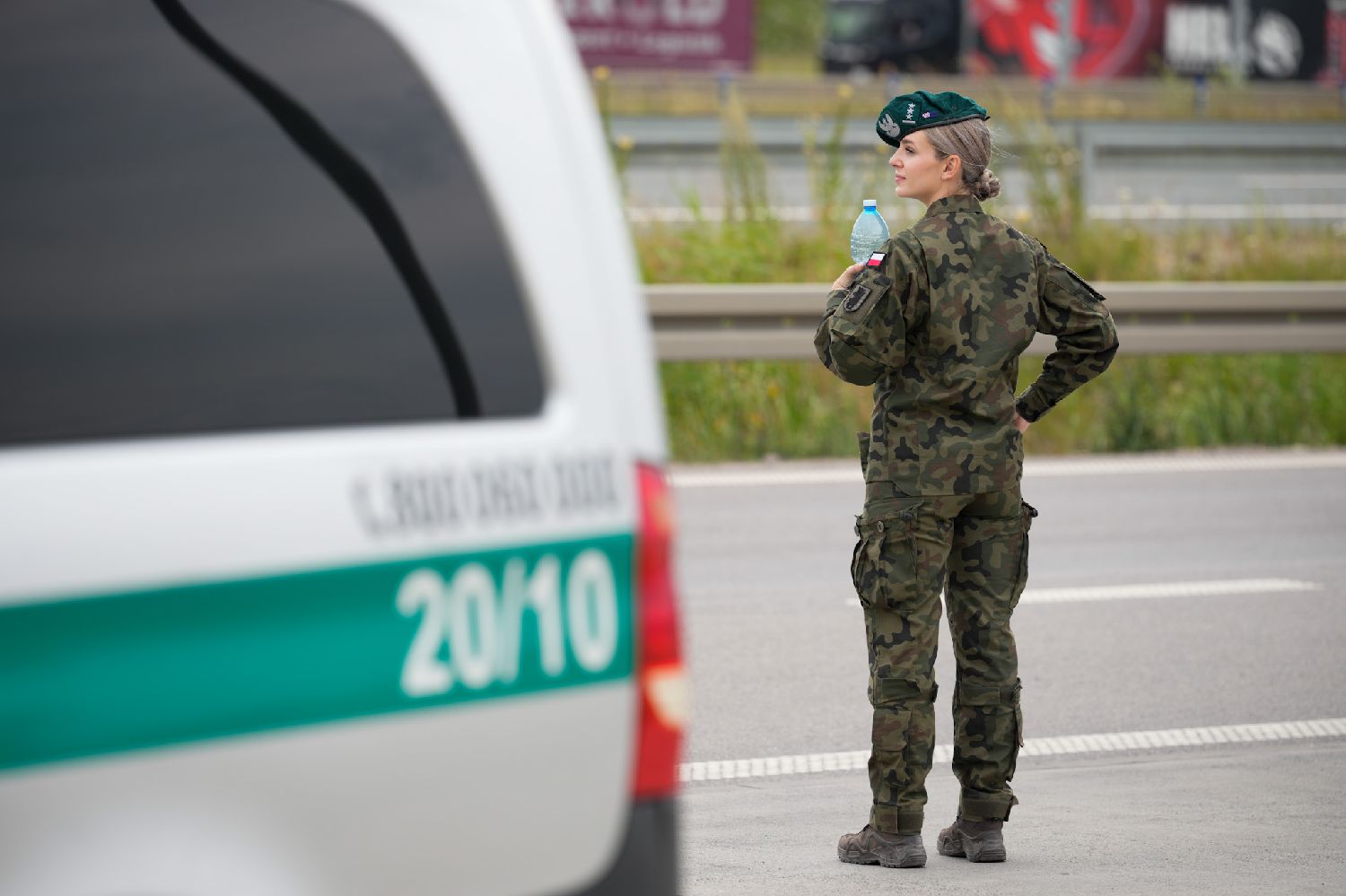 7月7日,在波兰与立陶宛交界的苏瓦乌基县布济斯科村,一名波兰边防女警在路边执勤。