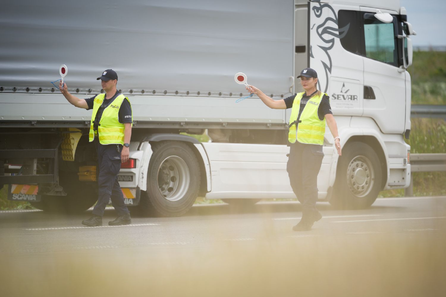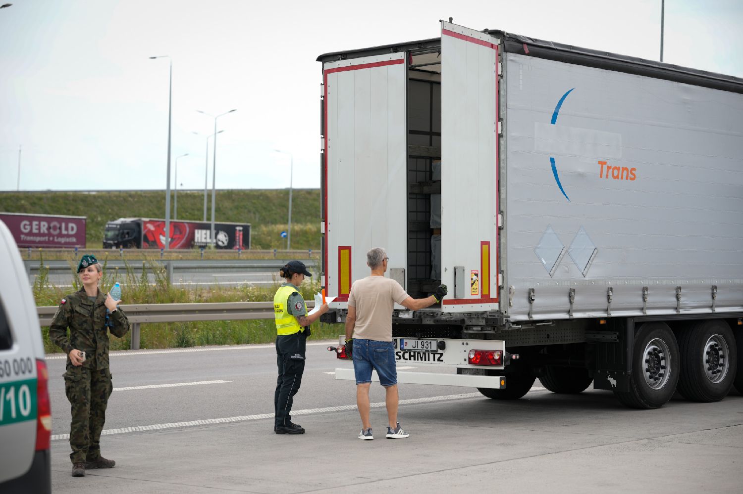 7月7日,在波兰与立陶宛交界的苏瓦乌基县布济斯科村,边防人员在高速公路检查点对一辆货运卡车进行检查。