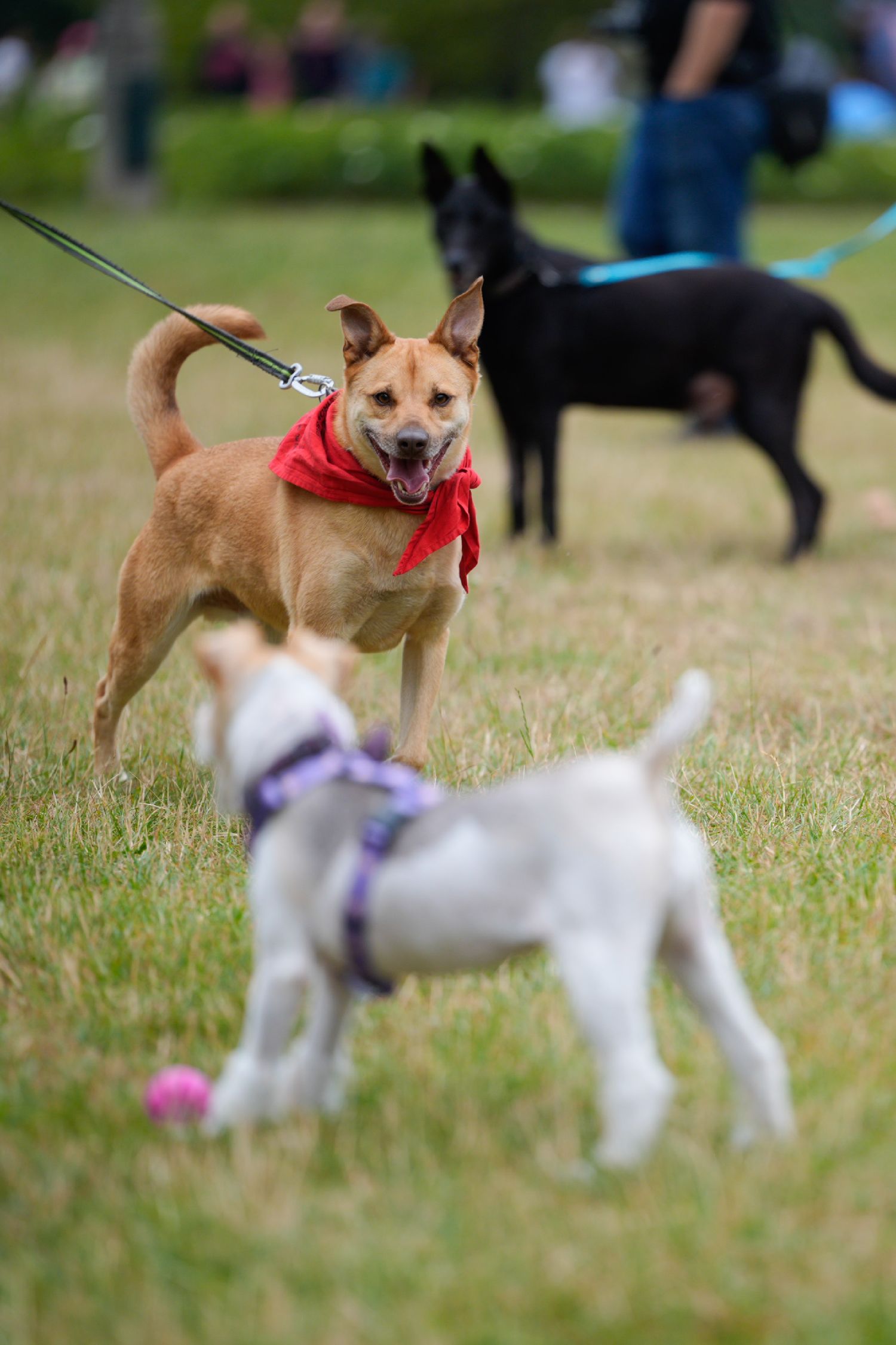 9月7日,在波兰华沙一座公园,几只狗在领养日活动上互动。