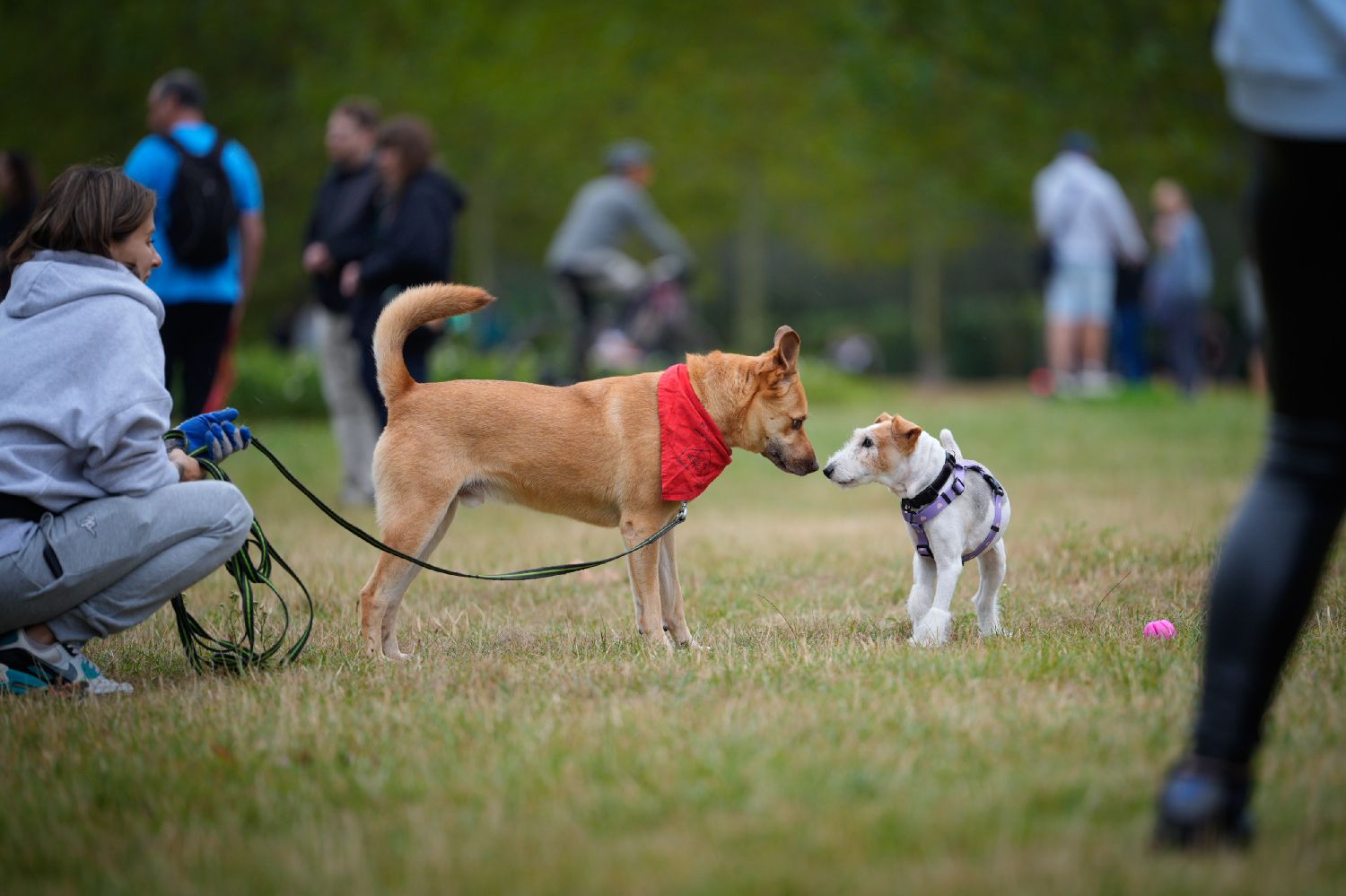 9月7日,在波兰华沙一座公园,两只狗在领养日活动上互动。