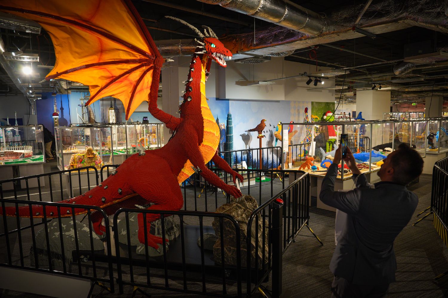 据估算,所有展品共使用了约2000万块积木。图为参观者在波兰华沙举行的乐高积木展上拍摄巨龙模型。