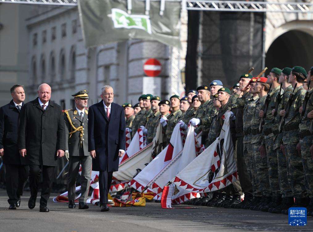 10月26日,在奥地利维也纳,奥地利总统范德贝伦(前右)和总理施托克尔(前左)检阅入伍新兵。