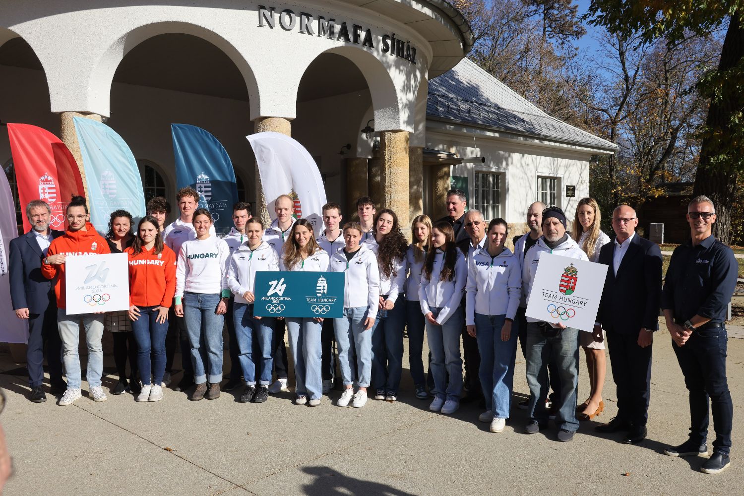 10月29日,部分匈牙利冬奥会选手在首都布达佩斯举行的新闻发布会后合影。