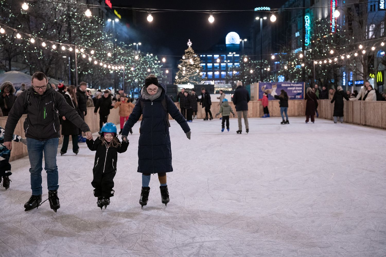 11月29日,在捷克首都布拉格,人们在圣诞市场滑冰。
