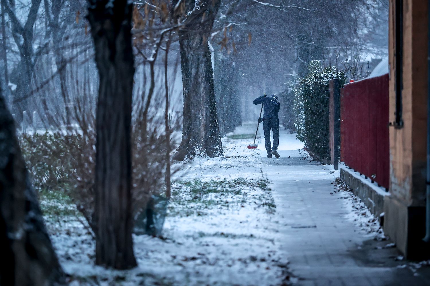 1月5日,在匈牙利布达佩斯,当地居民在打扫路面积雪。