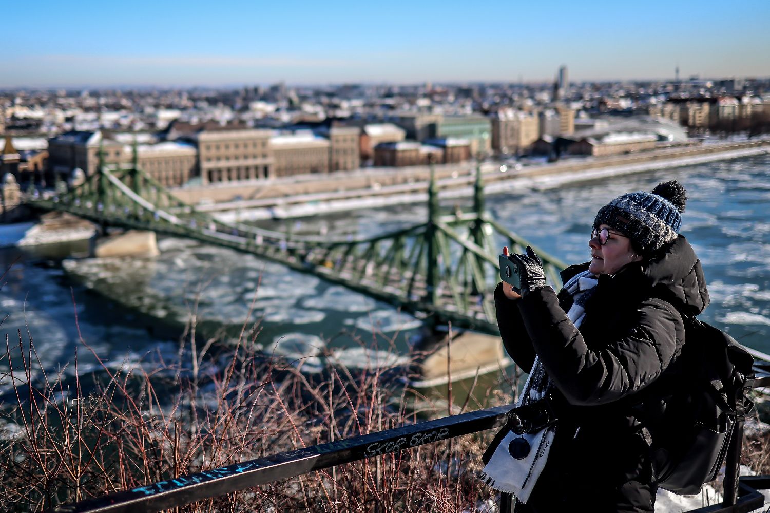 1月12日,在匈牙利布达佩斯,一名女士拍摄漂流着浮冰的多瑙河。