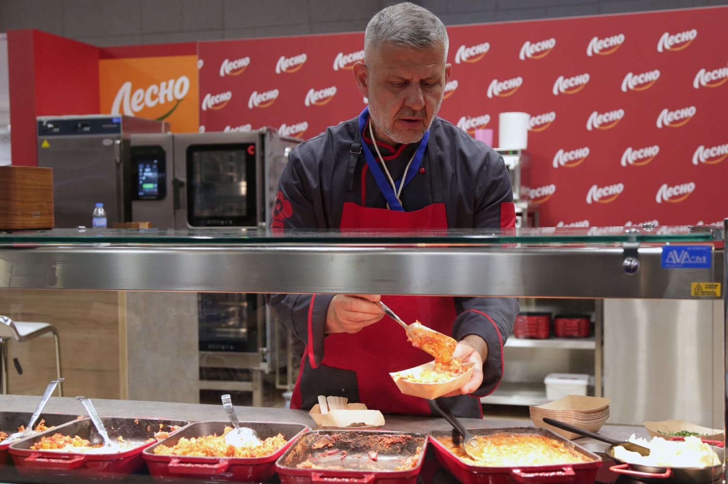 1月27日,在保加利亚索非亚,厨师在展位前准备焗烤类食材。