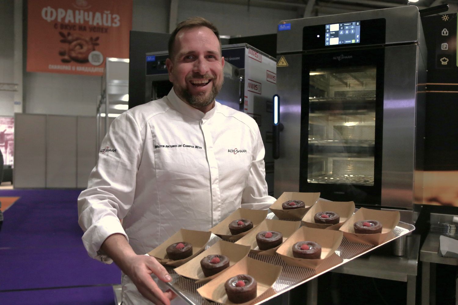 1月27日,在保加利亚索非亚,厨师展示用烤箱烘焙的巧克力熔岩蛋糕。