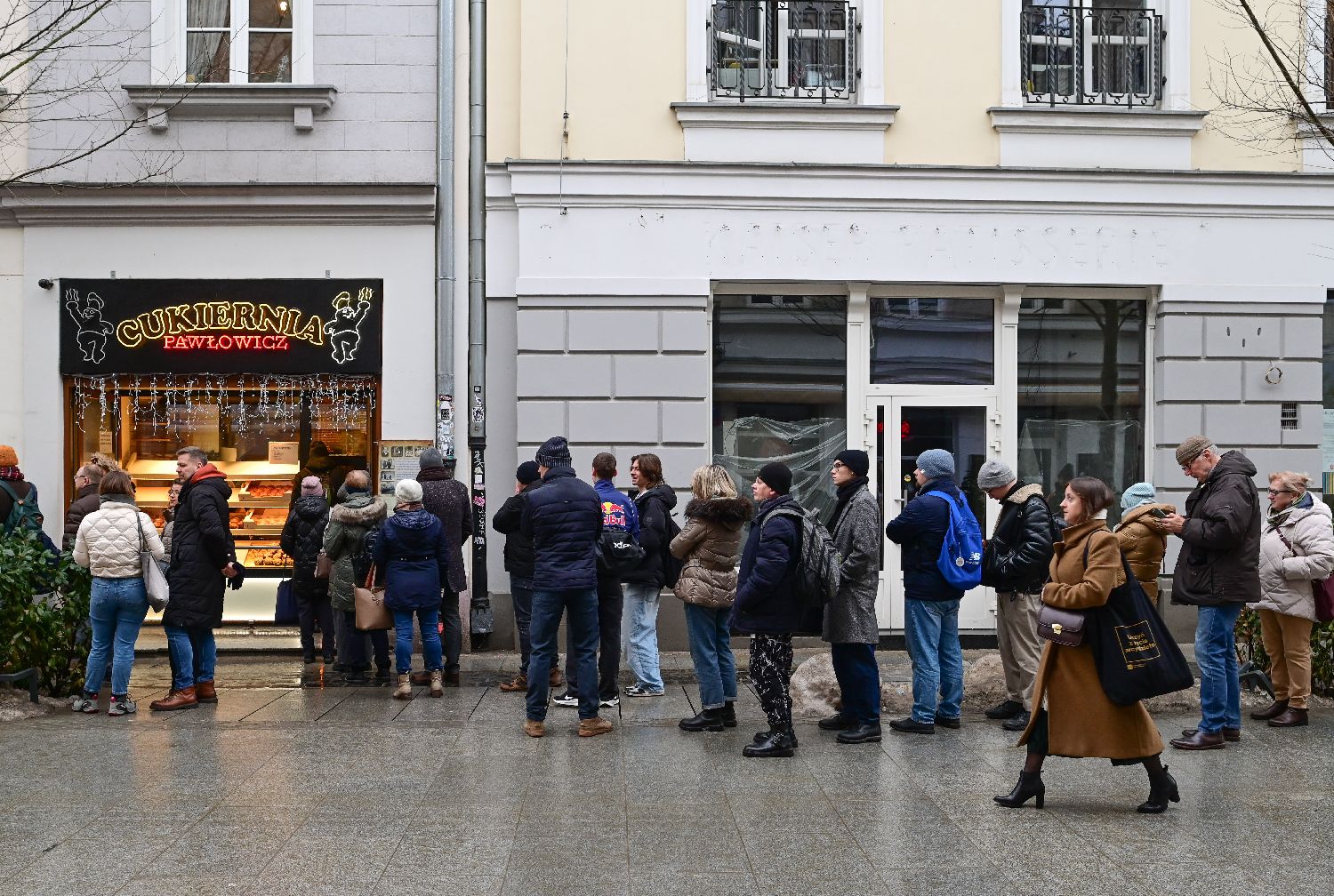 2月12日,在波兰首都华沙,顾客在一家甜品店外排队购买甜面包。