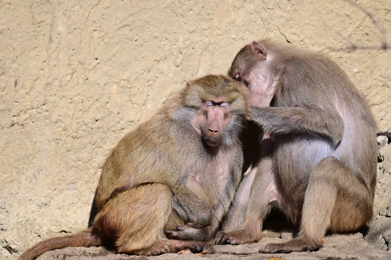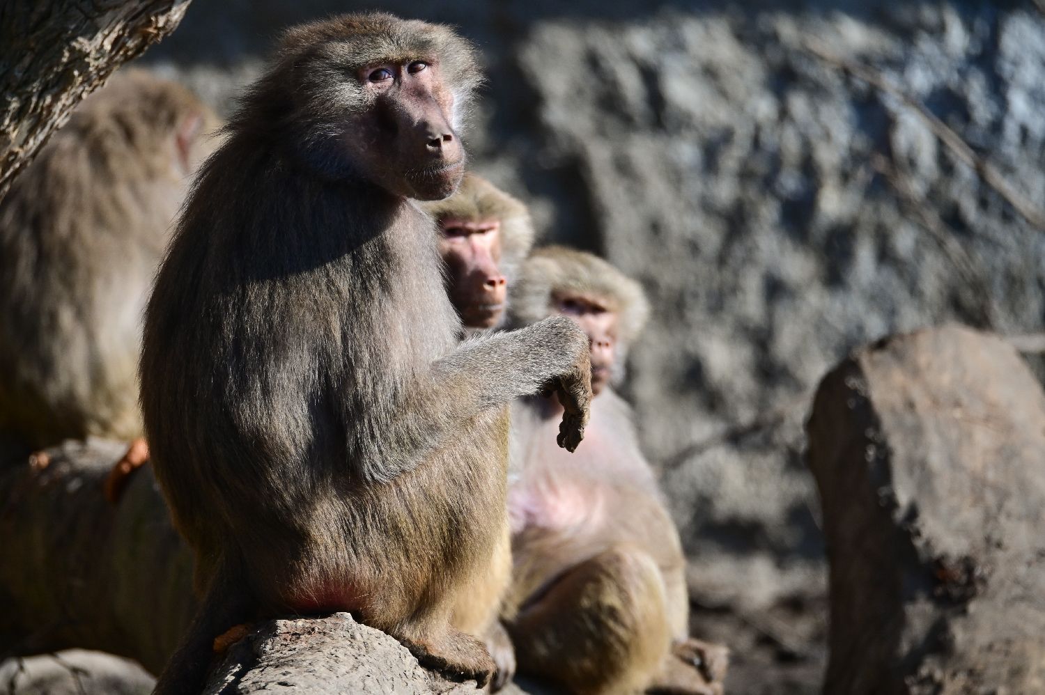 2月26日,在波兰华沙动物园,狒狒在户外晒太阳。
