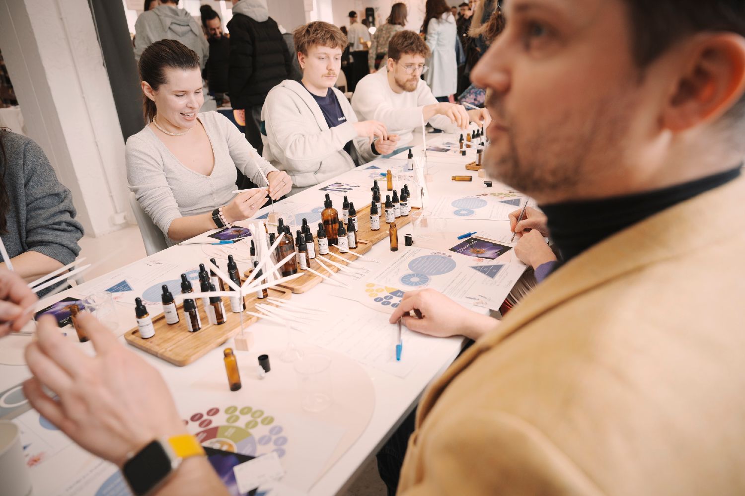 3月28日,参观者在波兰首都华沙举办的香氛博览会上参加香水制作体验活动。