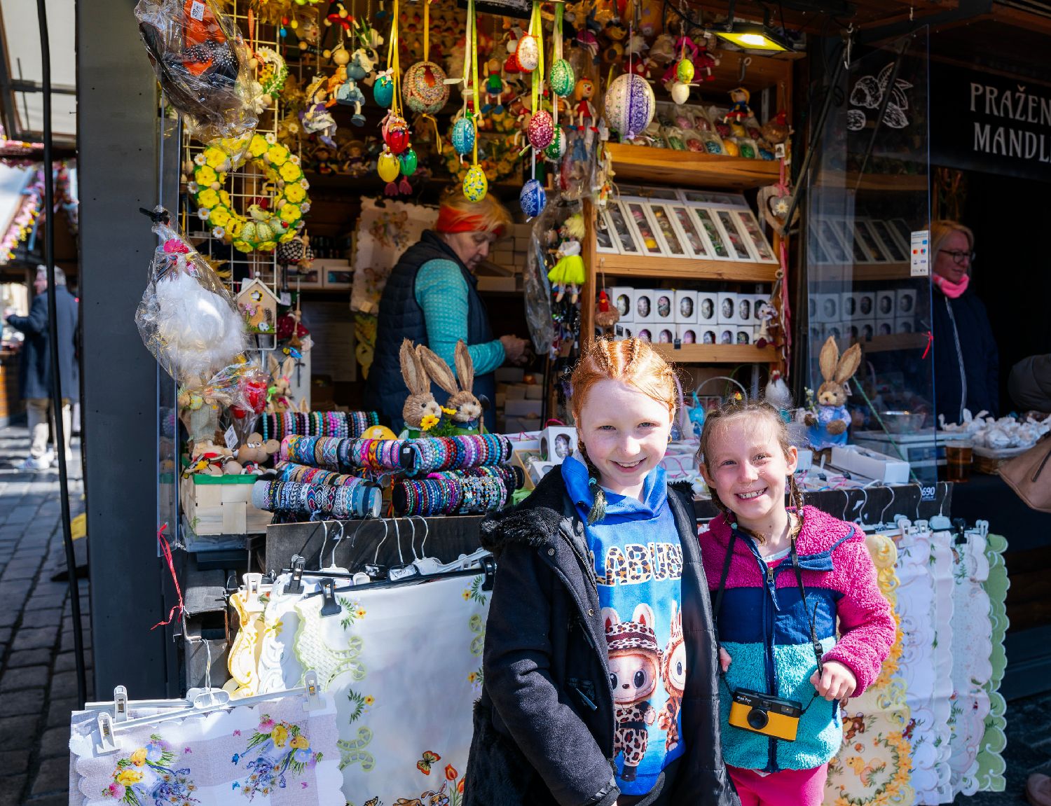 4月2日,儿童在捷克布拉格复活节集市的摊位前留影。(图片来源:本文图片均据新华社)