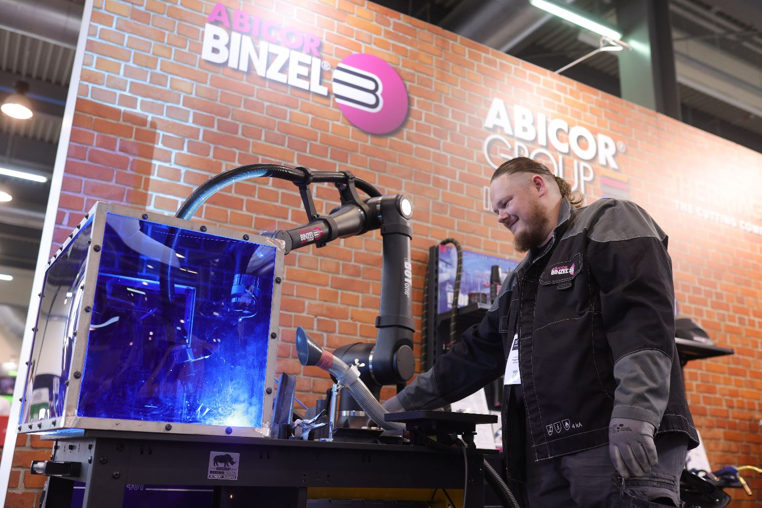 4月16日,在斯洛文尼亚采列,参展商在展会上介绍一款焊接机器人。(图片来源:本文图片均据新华社)