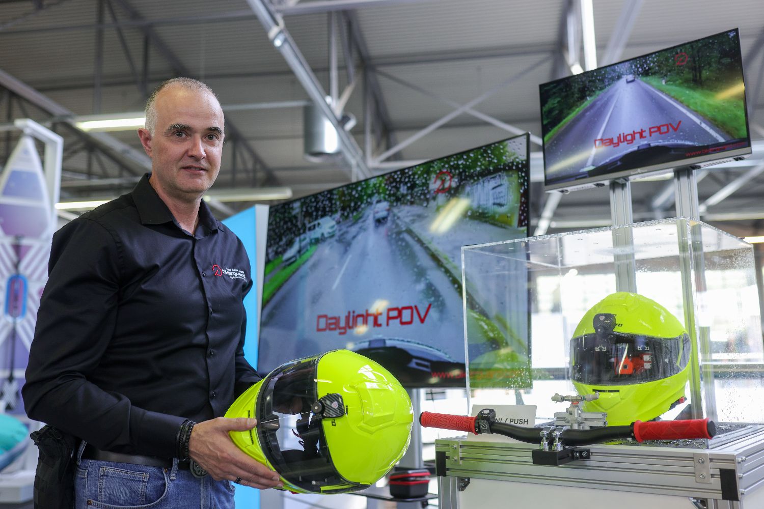 4月16日,在斯洛文尼亚采列,参展商在展会上介绍一款头盔雨刮器。