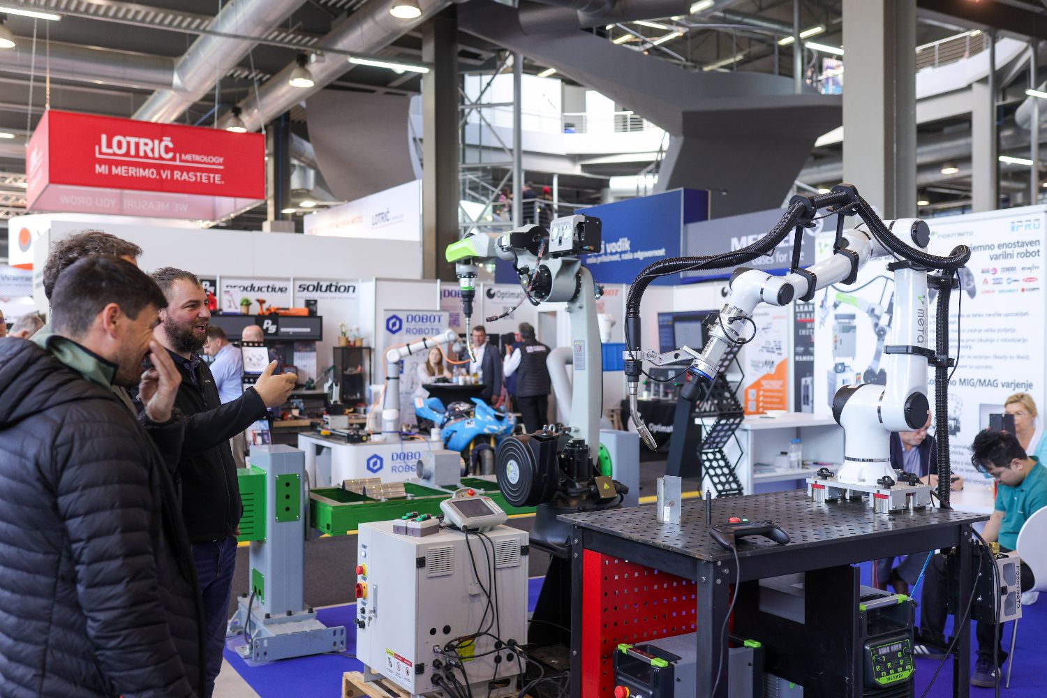 4月16日,在斯洛文尼亚采列,观众在展会上观看焊接机器人作业。