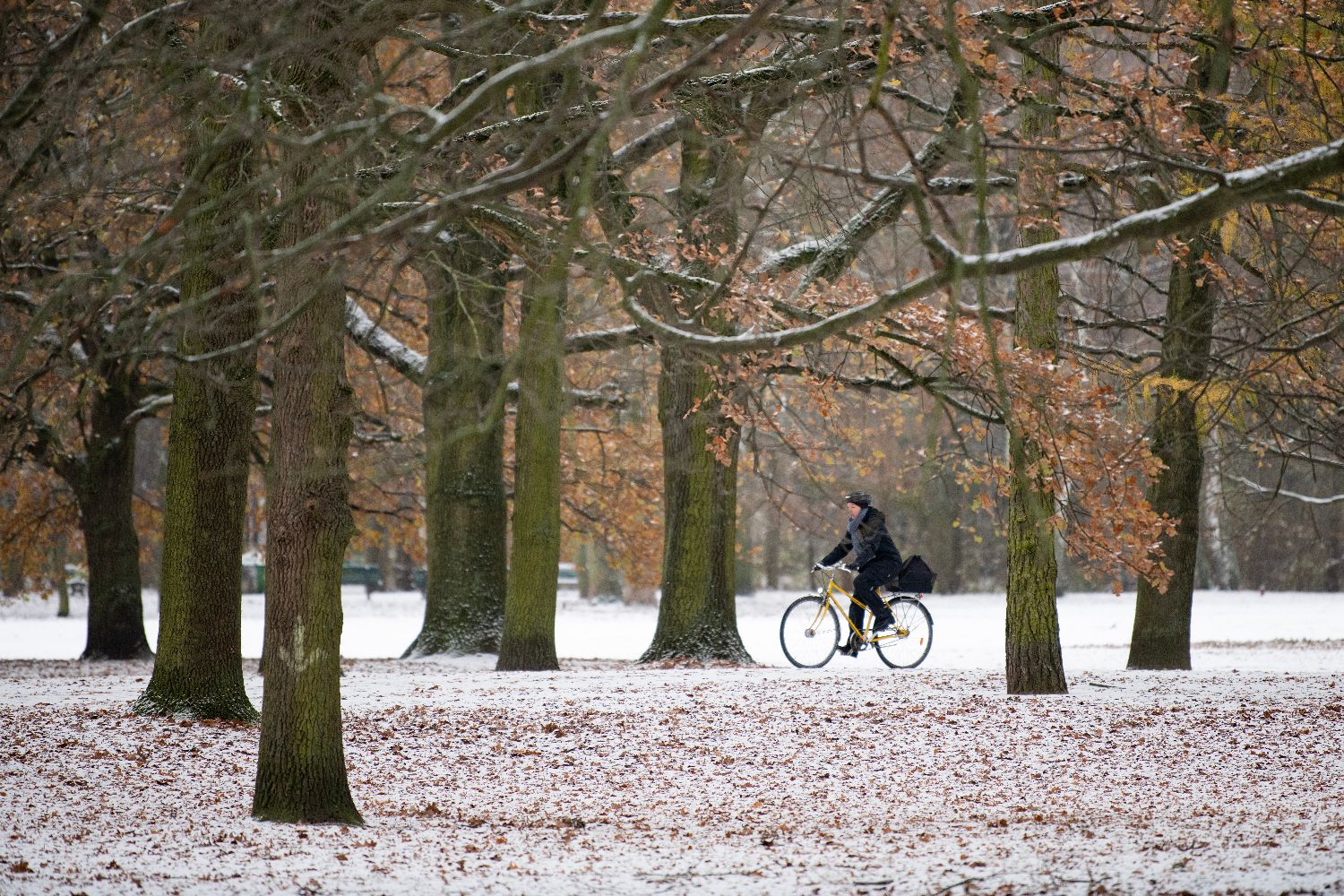 11月24日,一名女子骑车经过德国柏林蒂尔加滕公园。