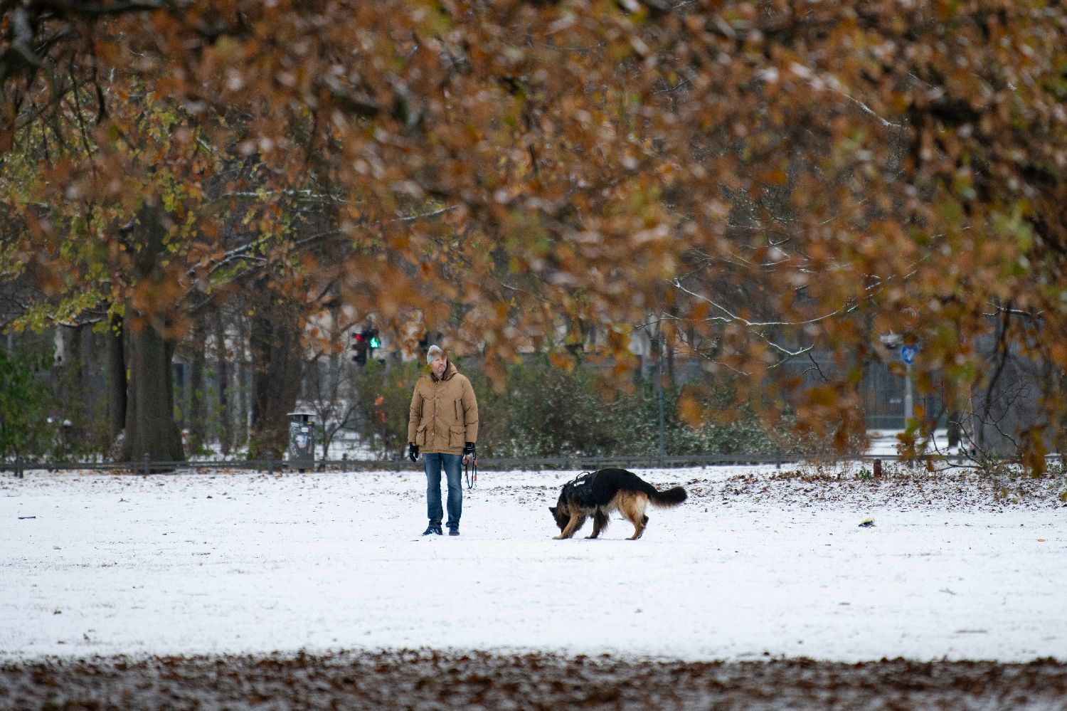 11月24日,一名男子在德国柏林蒂尔加滕公园内遛狗。