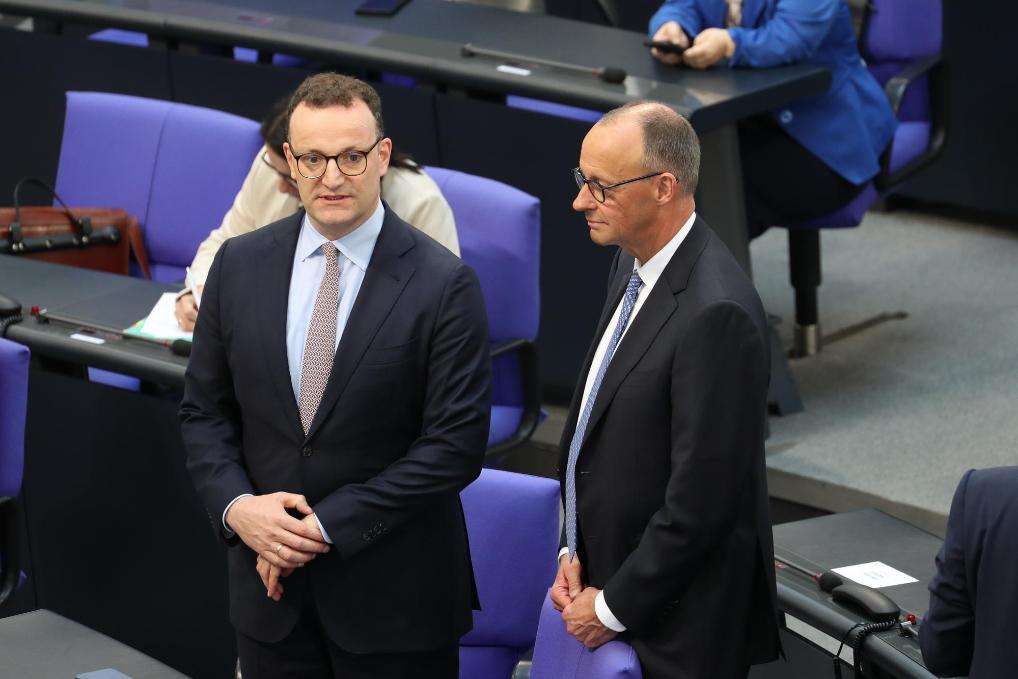 5月6日,在德国首都柏林的国会大厦,默茨(右)在第二轮投票议程中。(图片来源:新华社)