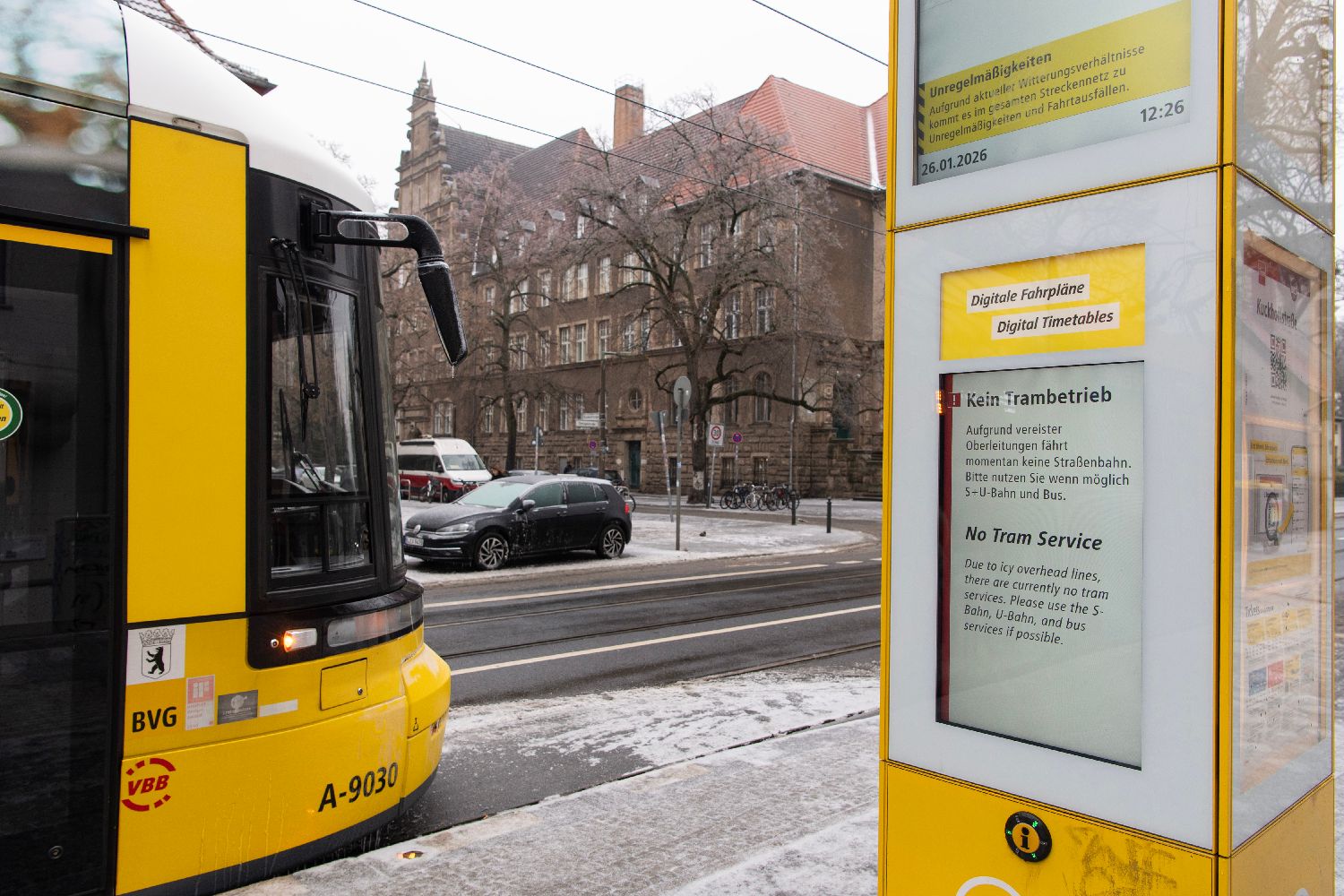 1月26日,在德国首都柏林潘科区,公交站台屏幕显示因电线结冰导致电车停运。