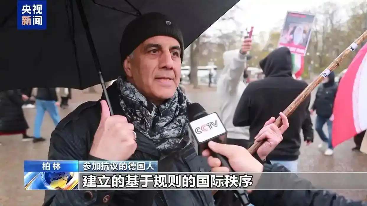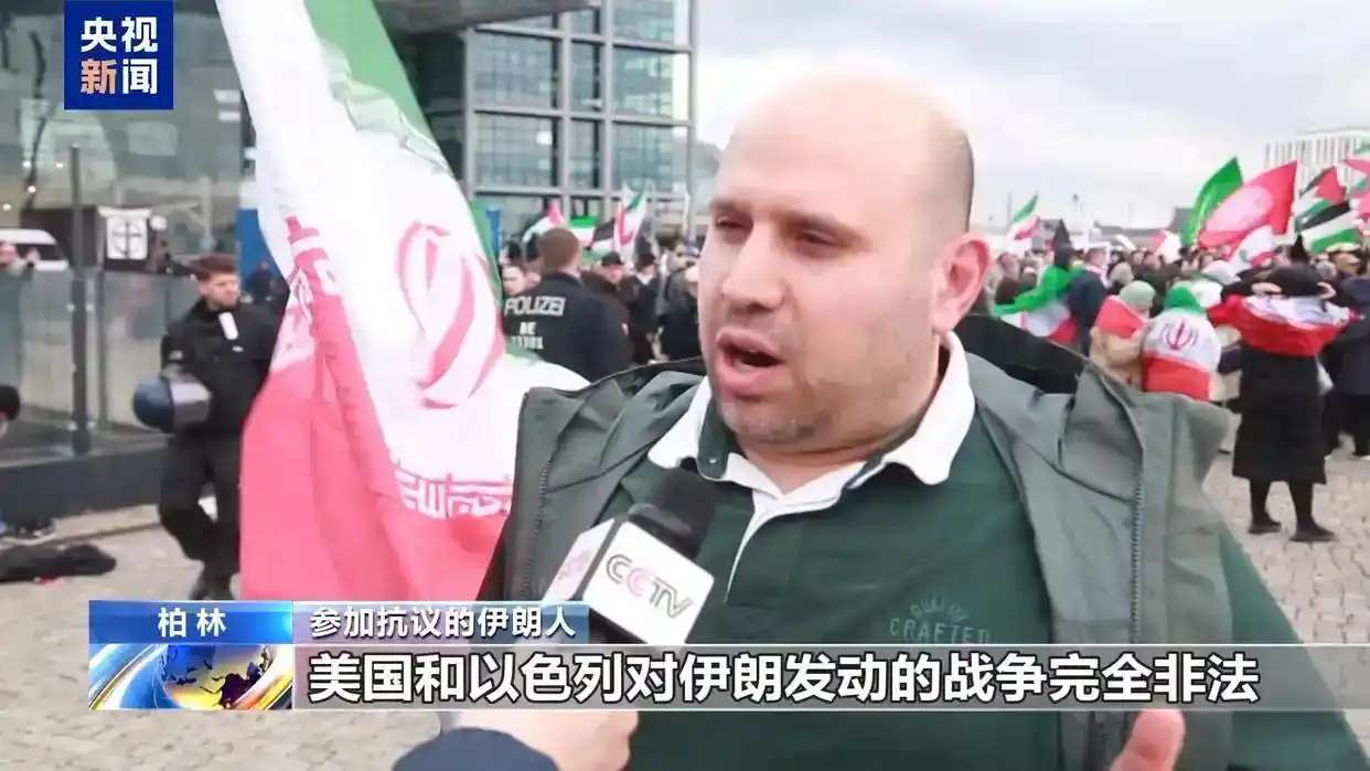 参加抗议的德国人:美以对伊朗发动的是一场非法的侵略战争,这违反了《联合国宪章》,必须立即停止。否则将违背1945年二战胜利后建立的、基于规则的国际秩序,并将导致人们重回丛林法则的世界。(图片来源:中国央视新闻)