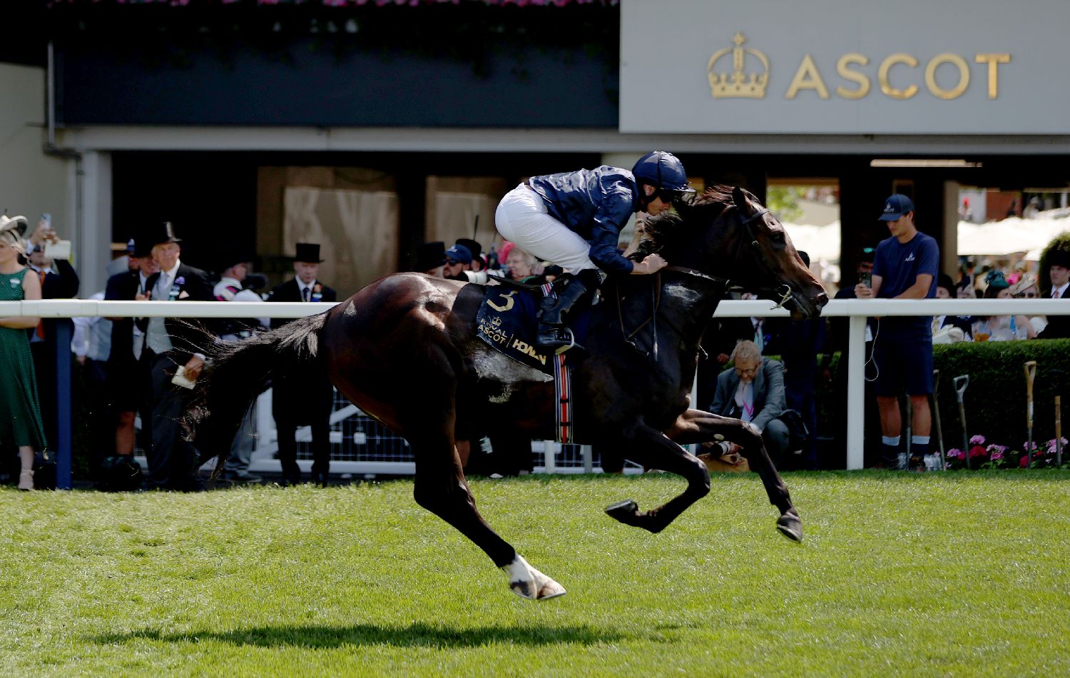 赛马会每年六月的第三周都会在阿斯科特小镇举行。图为6月19日,在英国阿斯科特,一名骑手骑乘赛马参加比赛。