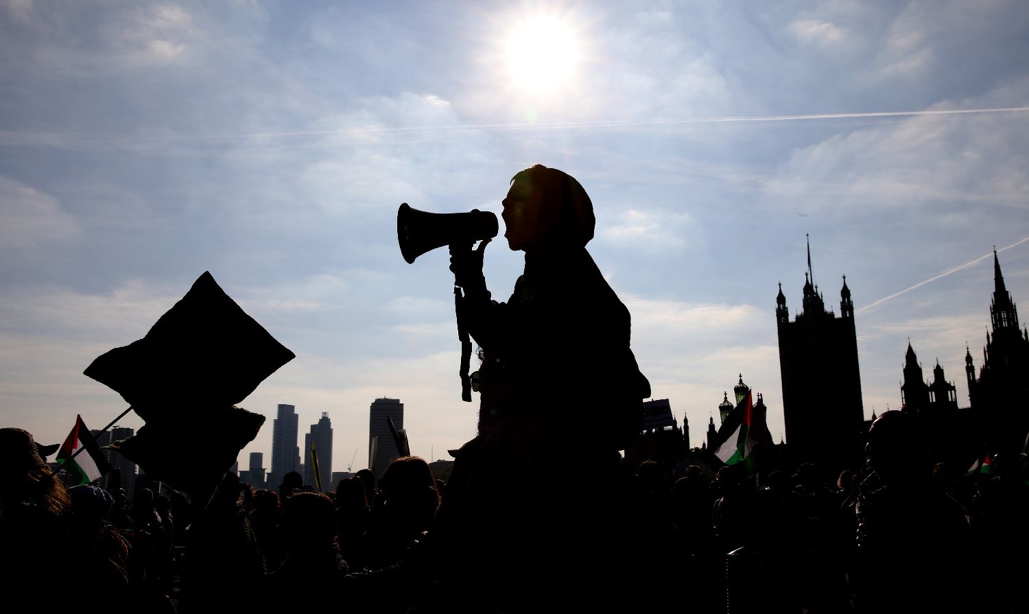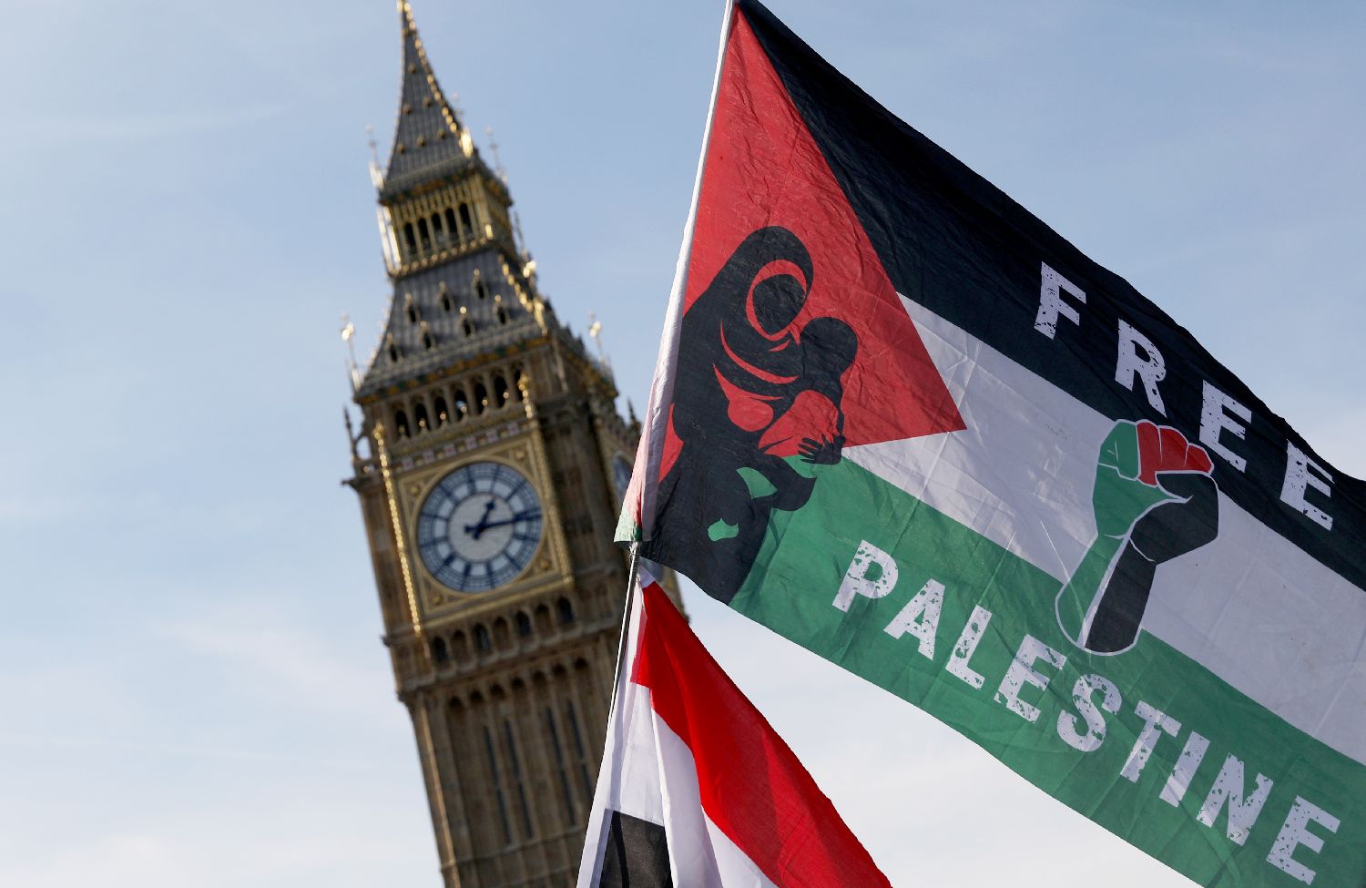 10月11日,英国民众在伦敦举行游行活动声援巴勒斯坦,呼吁加沙实现持久和平。