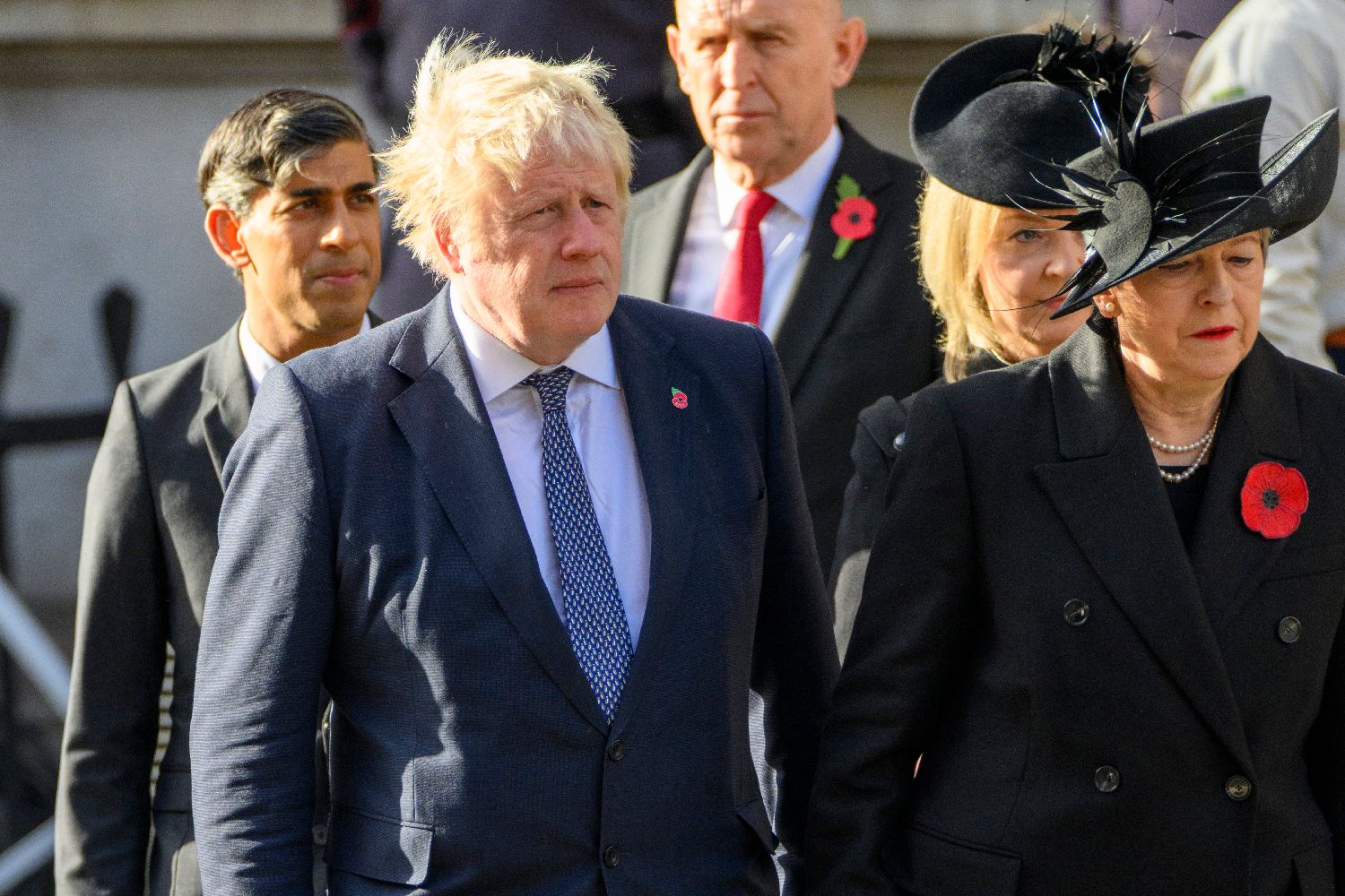 11月9日,在英国伦敦,英国前首相鲍里斯·约翰逊(前左)、特蕾莎·梅(前右)、里希·苏纳克(后左)和伊丽莎白·特拉斯(后右)出席国家停战纪念日活动。
