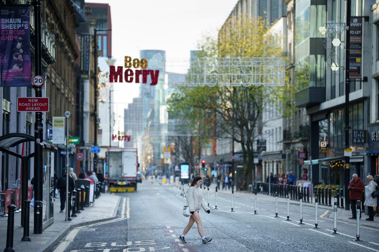11月26日,一名女子行走在英国曼彻斯特街头。(图片来源:本文图片均据新华社)