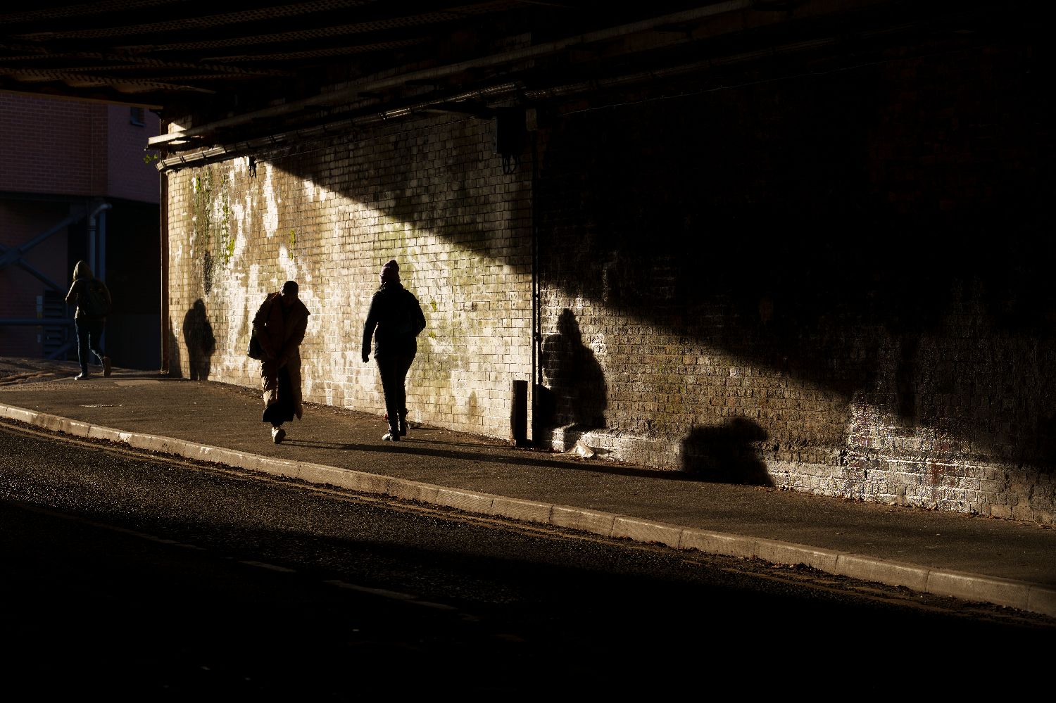 11月26日,人们行走在英国曼彻斯特一处立交桥下。