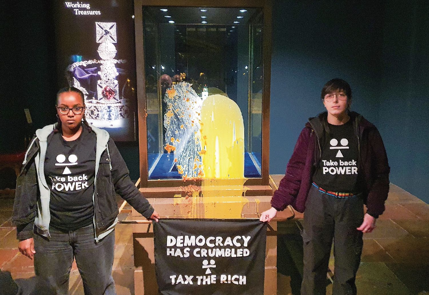12月6日上午9点48分,伦敦塔内陈列英国国王王冠的展柜被四名抗议者涂抹甜点和蛋奶沙司,抗议者同时高呼,“民主崩溃了!”“英国已经崩溃”。“我们来到这里,来到国家的瑰宝面前,是为了夺回权力”。